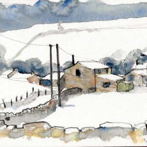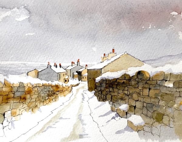 Capture the quiet beauty of winter with pen, ink, and watercolour wash.