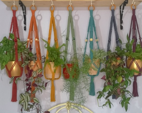 Learn basic knotting techniques including tension and the ‘magic knot’. You can stand or sit at your macrame ‘creation station’ – fully adjustable to suit you. You will be provided with all the materials needed to make your beautiful plant hanger including coloured cords, scissors, tape measure, paper tape, hooks and an assortment of beads. All the beautiful soft colourful cords are made from recycled fabrics & textiles, broken down and remade into gorgeous organic muted earthy colours. Be guided by Ness who will share her experience and skills so that you come away with a beautiful macrame plant hanger unique to you and your imagination.
